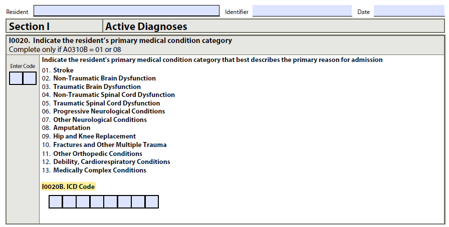 It was previously noted that the ICD-10 code that reflects the reason for the SNF stay would pull from form MDS section I8000A. However, this updated patient classification FAQ clarifies that this critical piece to the patient classification system will now pull from a newly added line item in Section I, I0200B. This item will ask what the main reason the patient is being admitted to the SNF. It will be coded with item I0020 when coded as any 1-13 category responses.