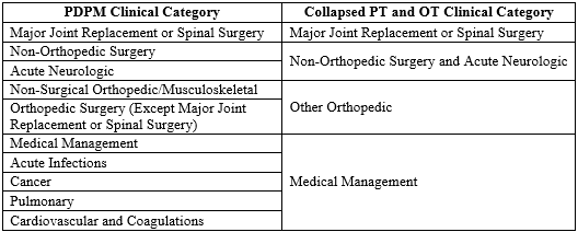This updated fact sheet explains, “ICD-10-CM codes, coded on the MDS 3.0 in Item I0020B, are mapped to a PDPM clinical category. This clinical classification, based on the primary SNF diagnosis, may be adjusted in cases where the patient received a surgical intervention during the preceding hospital stay associated with that diagnosis. These surgical procedures are captured in items J2100 through J5000 on the MDS. On the basis of the patient’s primary diagnosis and presence of a surgical category, the patient is then classified into one of the ten clinical categories listed in the table below”.