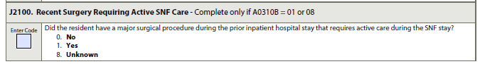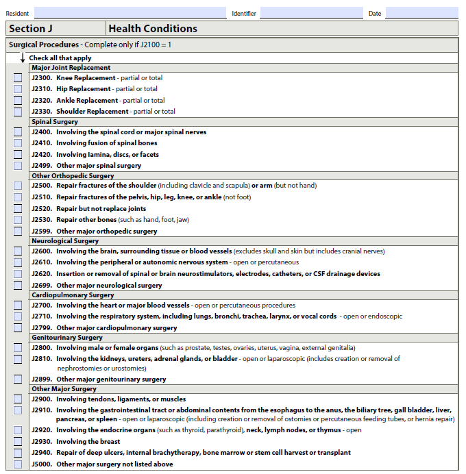 In addition, there are new items to MDS section J (J2100-J5000). This section will be used to capture if a surgical procedure was performed during the most recent qualifying hospital stay. Providers will need to check the boxes, and this will be used with the diagnosis code recorded in section I0020B for classification in to the PT and OT case-mix classification groups.