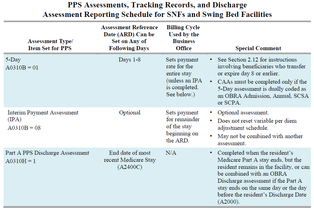 • If a resident changes payers from Medicare Advantage to Medicare Part A, the SNF must complete a 5-Day assessment with the ARD set for one of days 1 through 8 of the Medicare Part A stay, with the resident’s first day covered by Medicare Part A serving as Day 1, unless it is a case of an interrupted stay.