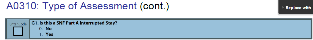 • Code 1, yes: if the resident was discharged from SNF care (i.e., from a Medicare Part A-covered stay) but did resume SNF care in the same SNF within the interruption window.