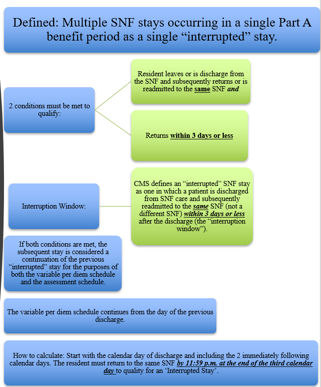 The Interruption Window is a 3-day period, starting with the calendar day of discharge and including the 2 immediately following calendar days. In other words, if a resident in a Medicare Part A SNF stay is discharged from Part A, the resident must resume Part A services, or return to the same SNF (if physically discharged) to resume Part A services, by 11:59 p.m. at the end of the third calendar day after their Part A-covered stay ended. If both conditions are met, the subsequent stay is considered a continuation of the previous Medicare Part A-covered stay for the purposes of both the variable per diem schedule and PPS assessment completion.