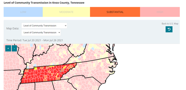 Drilling down on the County page will also provide you with the percentage of County that is vaccinated, and case counts both current and historical. Please remember to check Counties that you frequent as the recommendations will change. Although I live in Knox County, TN and it is listed as “substantial risk,” the adjacent County I frequently visit is “high risk.”