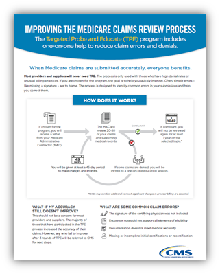 They’re ba-ack! Targeted Probe and Educate (TPE) audits. The Centers for Medicare and Medicaid Services (CMS) resumed the TPE audits in August, just a short time ago. Why? Because they have a goal to help us quickly improve the accuracy of our claims. The Medicare Administrative Contractors (MACs) work with providers to identify errors and help correct them since many common errors are simple oversights, such as a missing physician’s signature, and therefore are easily corrected. The overall goal of a TPE is to increase the accuracy in our documentation practices in very specific areas (target areas).