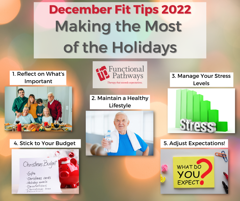 - Adjust Expectations. Manage your expectations this holiday season. Often our greatest disappointments lie in our expectations. Remember what is truly important to you, like getting to spend time with family, and let the smaller things go. Be clear about when you need the most, and try to be flexible about the rest.