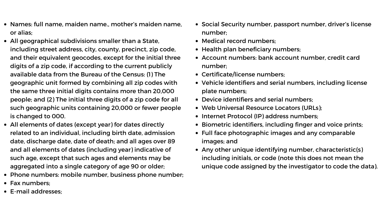 PII is information that, when used alone or with other relevant information, can identify an individual. Below are some HIPAA personally identifiable information identifiers. This is not an all-inclusive list: