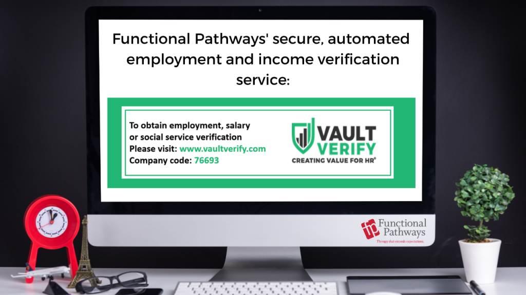 Functional Pathways utilizes a secure, automated employment and income verification service called Vault Verify so all employees can verify their employment and income. Vault Verify helps ensure our verification process remains consistent, secure, and easily managed. The Vault Verify service includes a pre-screening process of each requester to ensure that only authorized parties who have permissible purpose to obtain verification can do so.